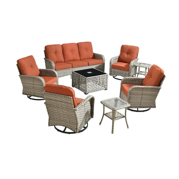 Vinceny Gray 8-Piece Wicker Patio Conversation Set with Orange Red Cushions and Coffee Table