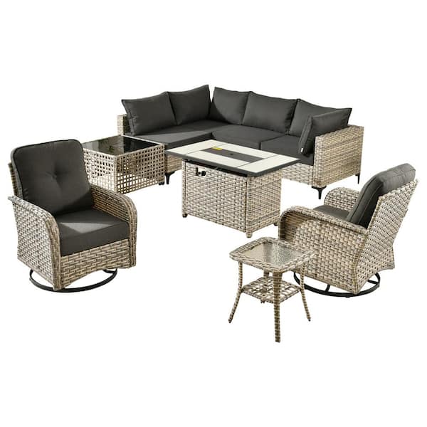 Vinceny Gray 9-Piece Wicker Patio Rectangle Fire Pit Conversation Set with Black Cushions and Swivel Chairs