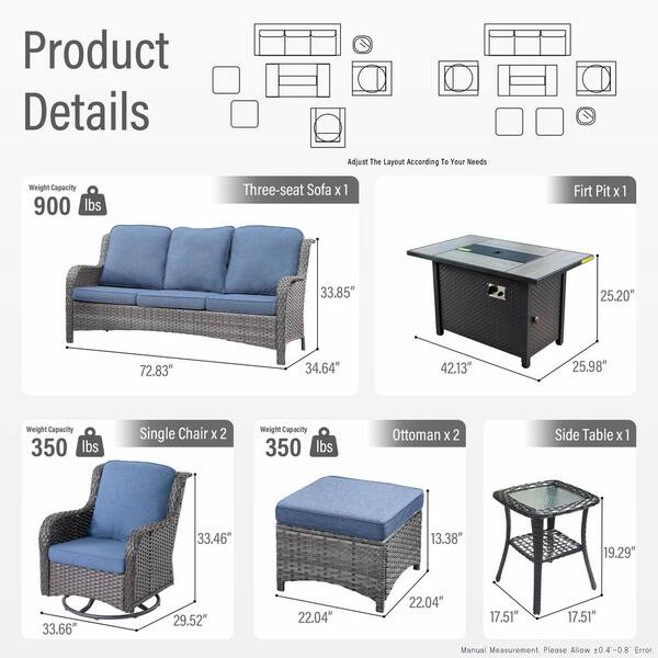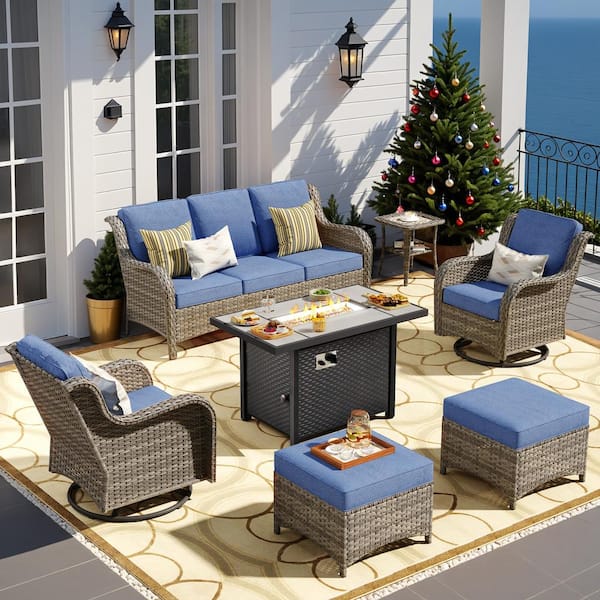 Yosemite Gray 7-Piece Wicker Patio Rectangle Fire Pit Conversation Set with Denim Blue Cushions and Swivel Chairs