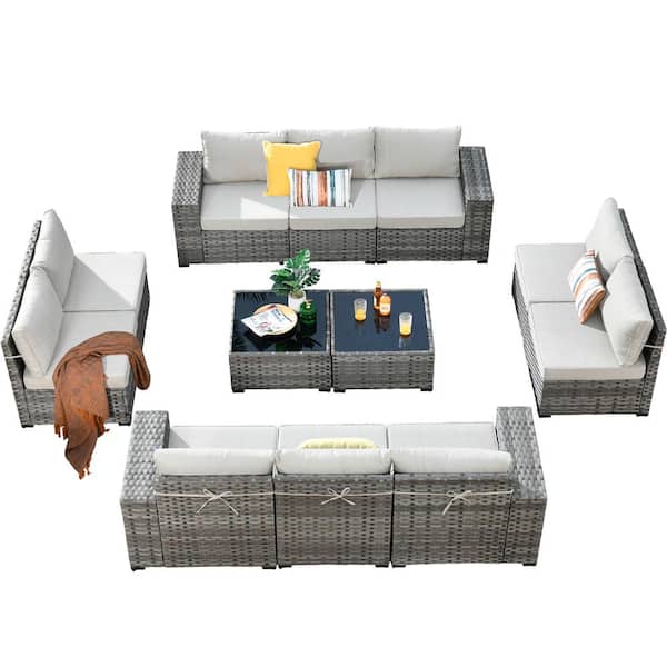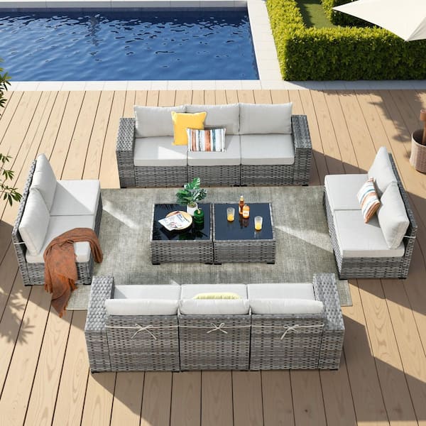 Zoila Gray 12-Piece Wicker 7.68 in. Wide Arm Outdoor Patio Sectional Set with Beige Cushions