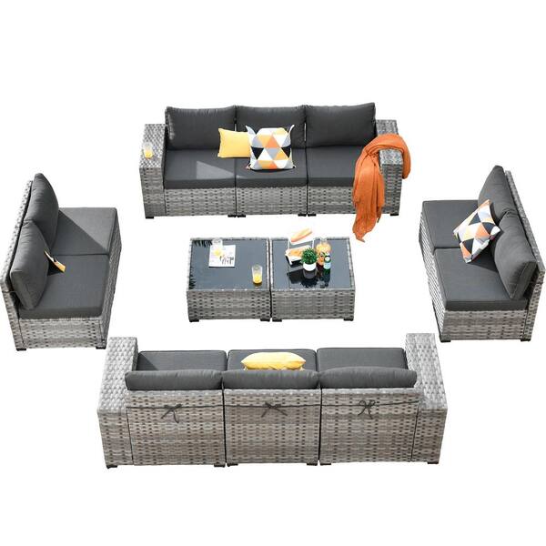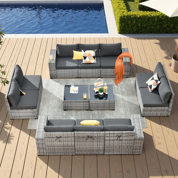 Zoila Gray 12-Piece Wicker 7.68 in. Wide Arm Outdoor Patio Sectional Set with Black Cushions