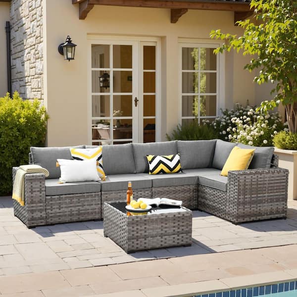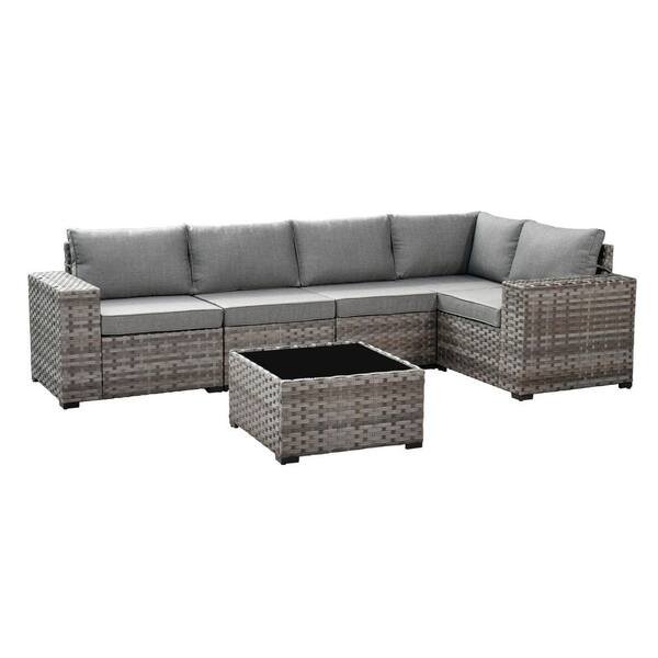Zoila Gray 6-Piece Wicker 7.68 in. Wide Arm Outdoor Patio Sectional Set with Dark Gray Cushions