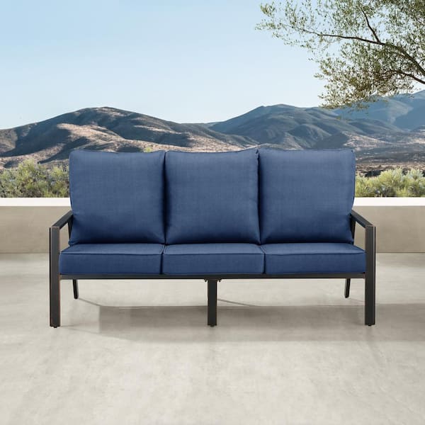 Black 1-Piece Aluminum Outdoor Deep Seating Deep Seating Couch with Cushion with Blue Cushions