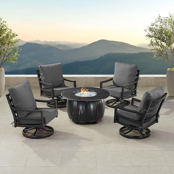 Black 7-Piece Aluminum Patio Fire Pit Set with 4-Club Chairs Black Cushions