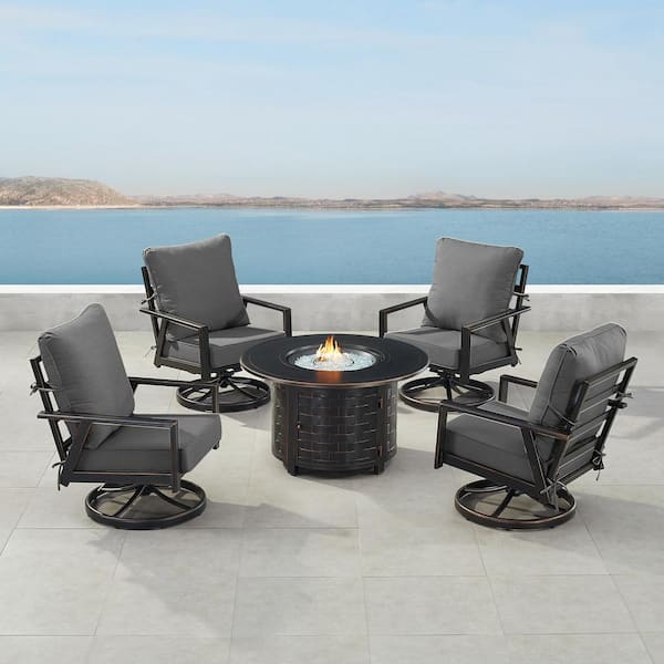 Black 7-Piece Aluminum Patio Fire Pit Set with 4-Club Chairs Black Cushions