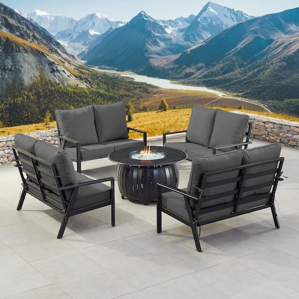 Black 7-Piece Aluminum Patio Fire Pit with 4-Deep Seating Loveseat Black Cushions