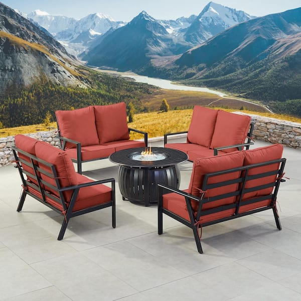 Black 7-Piece Aluminum Patio Fire Pit with 4-Deep Seating Loveseat Red Cushions