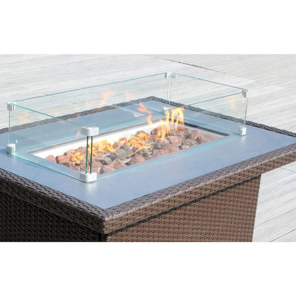 Ohana Dark Brown Rectangular Wicker 42 in. Fire Pit Table with Lid Lava Rocks and Glass Wind Guard