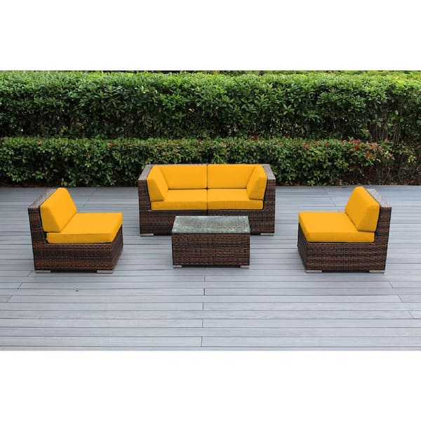 Ohana Mixed Brown 5-Piece Wicker Patio Seating Set with Sunbrella Sunflower Yellow Cushions