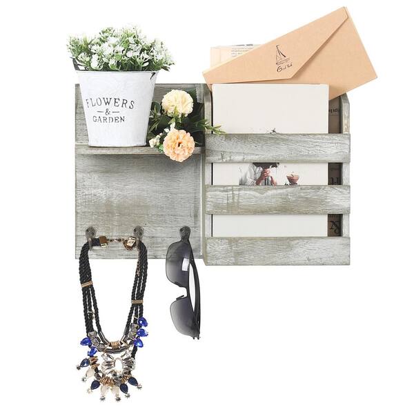 Olive Green Wall Mounted Wooden Mail Sorter Organizer with 3-Key Hooks Rustic Floating Shelf