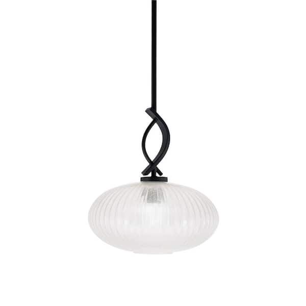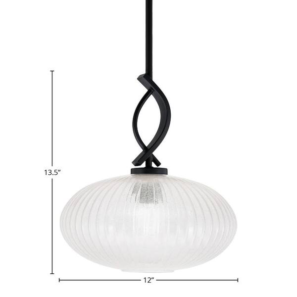Olympia 100-Watt 1-Light Matte Black Shaded Pendant Light with 12 in. Micro Bubble Ribbed Glass Shade, No Bulb Included