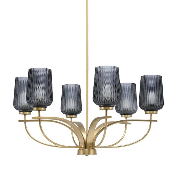 Olympia 6 Light, Uplight, Chandelier, New Age Brass Finish, 5 in. Smoke Textured Glass