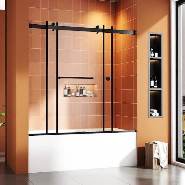 55 to 60 in. W x 56 in. H Sliding Tub Door in Black with Explosion-Proof Film Tempered Clear Glass