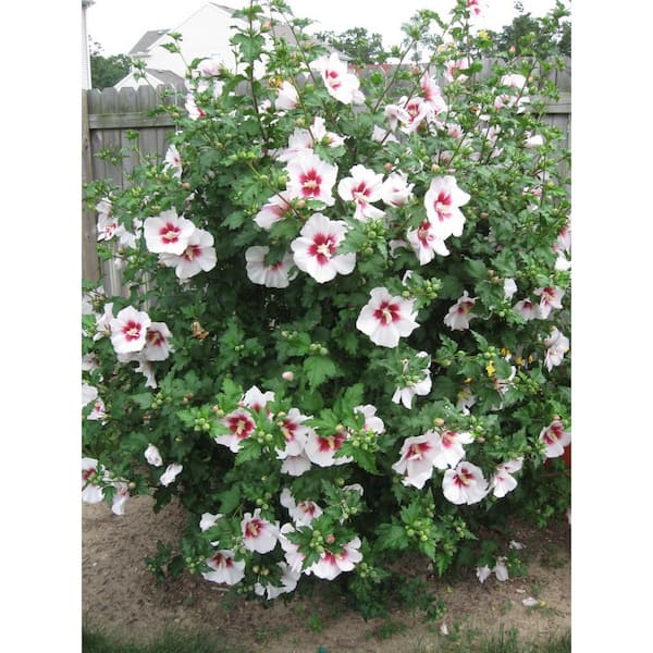 1 Gal. Red Heart Rose of Sharon Hibiscus Shrub Exotic Pure White Blossoms with a Colorful Red Splash