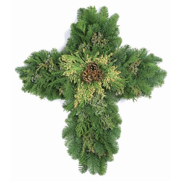 30 in. Live Christmas Cross Wreath with Fresh Pacific Northwest Incense Cedar, Noble Fir and Ponderosa Pine Cones