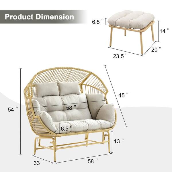 3-Piece Patio Egg Chair Set, 2-Person Yellow Wicker Outdoor Glider Loveseat with Beige Cushions and 2 Ottomans