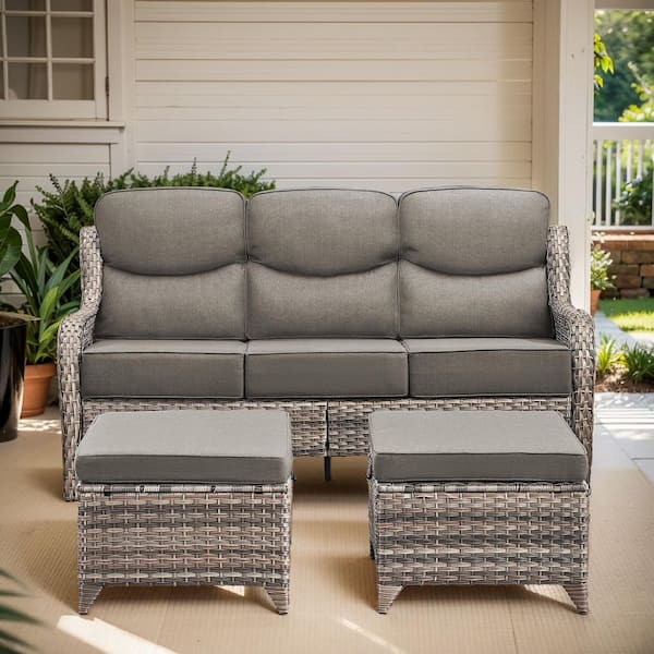 Arcadia 3-Piece Gray Wicker Outdoor 3-Seat Couch with High Curved Back and 6 in. Thick Gray Cushions and Ottomans