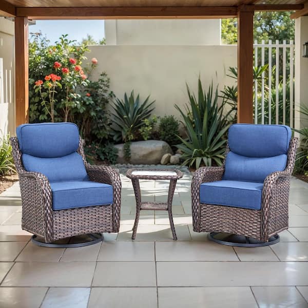 Arcadia Brown 3-Piece Wicker Swivel Rocker Patio Conversation Set with 6 in. Thick Navy Blue Cushions and Side Table