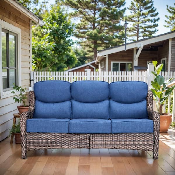 Arcadia Brown Wicker Outdoor 3-Seat Couch with High Curved Back and 6 in. Thick Navy Blue Box-Edge Cushions