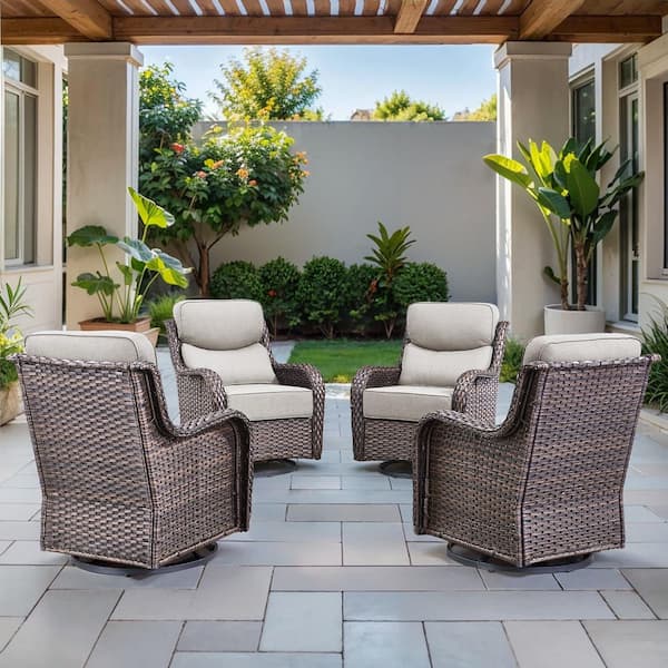 Arcadia Brown Wicker Outdoor Rocking Chair Patio Swivel Glider with 6 in. Thick Beige Box-Edge Cushions (4-Pack)