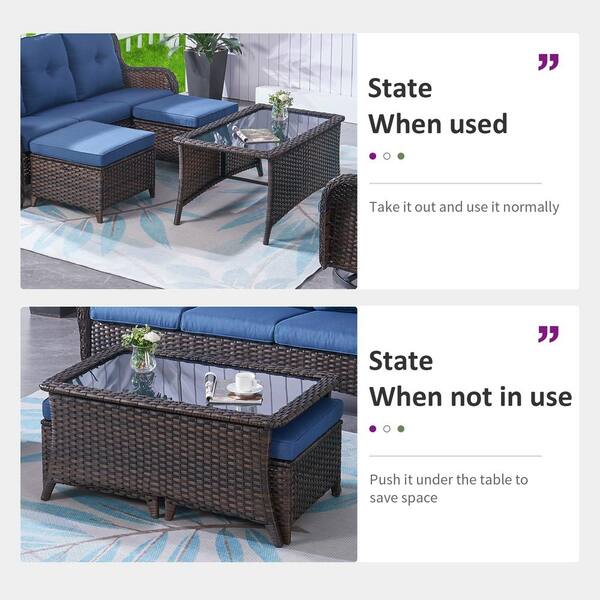 ArcoBay 2-Piece Brown Wicker Outdoor Loveseats Patio Conversation Set with Blue Cushions and Coffee Table