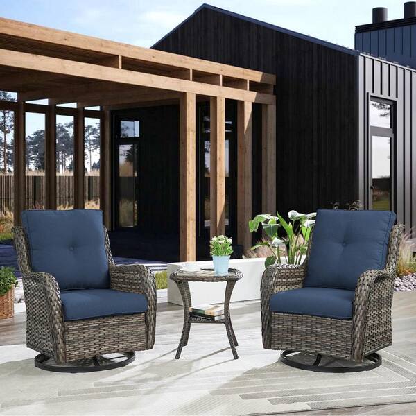ArcoBay 3-Piece Gray Wicker Swivel Outdoor Rocking Chairs Patio Conversation Set with Olefin Blue Cushions