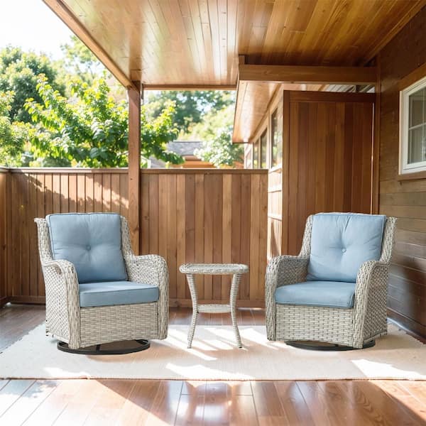 ArcoBay 3-Piece Light Beige Wicker Swivel Outdoor Rocking Chairs Patio Conversation Set with Olefin Baby Blue Cushions