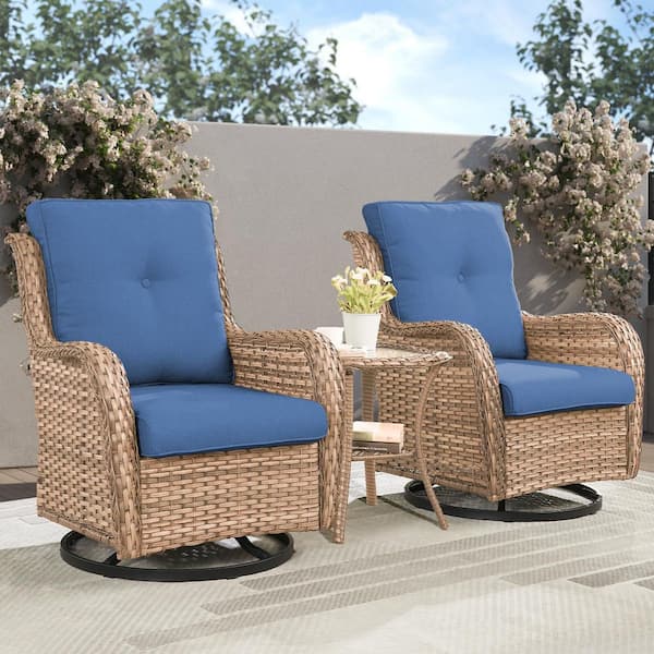 ArcoBay 3-Piece Yellow Wicker Swivel Outdoor Rocking Chairs Patio Conversation Set with Olefin Blue Cushions