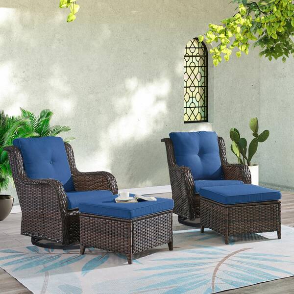 ArcoBay 4-Piece Brown Wicker Outdoor Rocking Chair Patio Swivel Chairs with Navy Blue Cushions and Ottomans