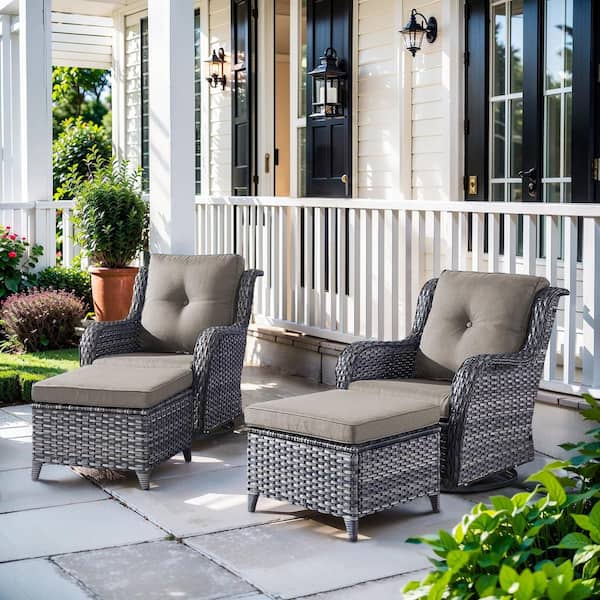ArcoBay 4-Piece Gray Wicker Outdoor Rocking Chair Patio Swivel Chairs with Gray Cushions and Ottomans