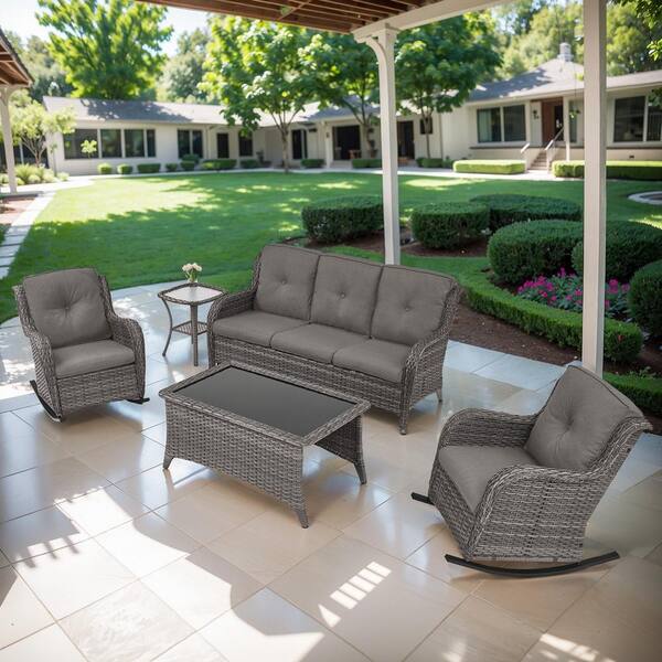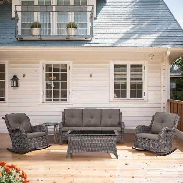 ArcoBay 5-Piece Gray Wicker Outdoor Rocking Swivel Chairs Patio Conversation Set with Gray Cushions and 3-Seat Sofa