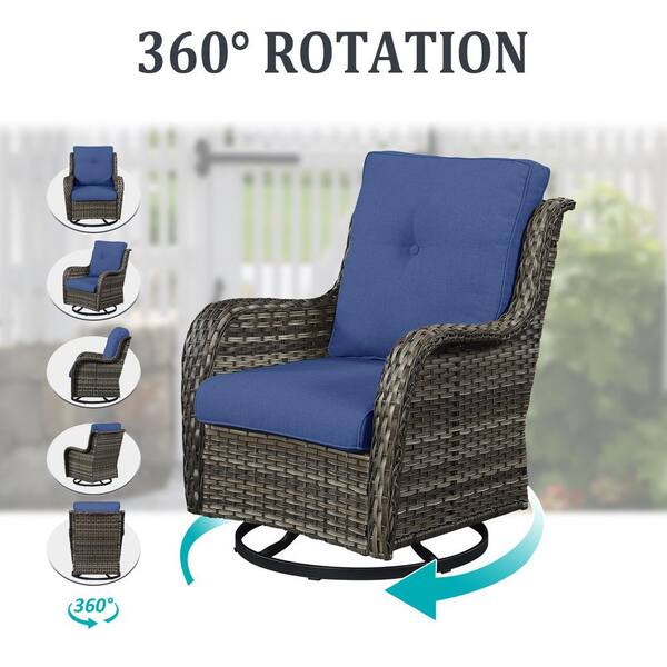 ArcoBay 5-Piece Gray Wicker Outdoor Rocking Swivel Chairs Patio Conversation Set with Navy Blue Cushions and Ottomans