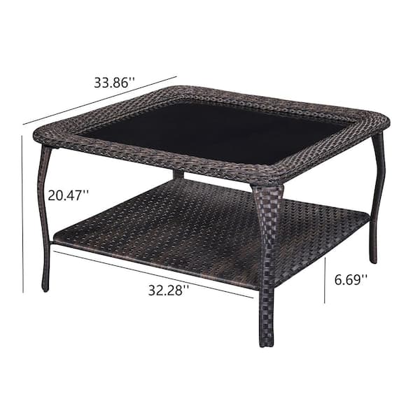 ArcoBay Brown Square Wicker Outdoor Coffee Table with Tempered Glass Top and Lower Wicker Storage Shelf