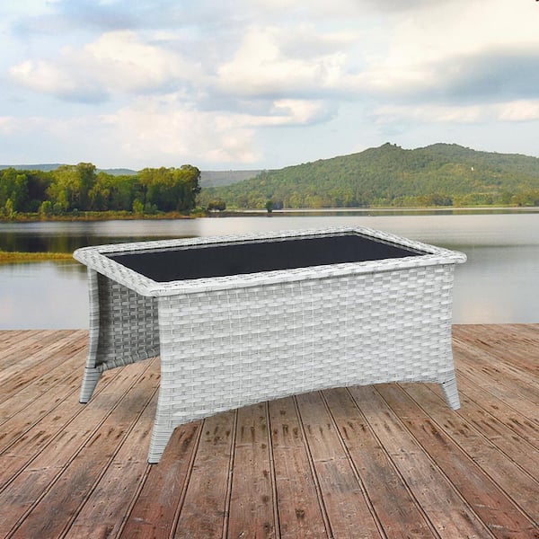 ArcoBay Light Beige Rectangular Wicker Outdoor Coffee Table with Tempered Glass Top