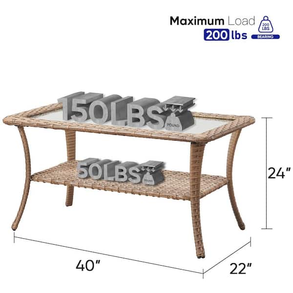 ArcoBay Yellow Rectangular Wicker Outdoor Coffee Table with Tempered Glass Top and Lower Wicker Storage Shelf