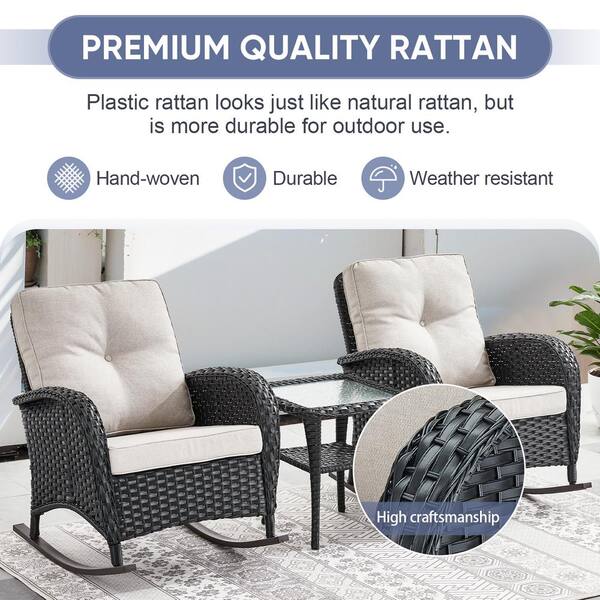 Black 5-Piece Wicker Patio Conversation Set with Rocking Chairs, Balcony Conversation Set with Beige Cushions