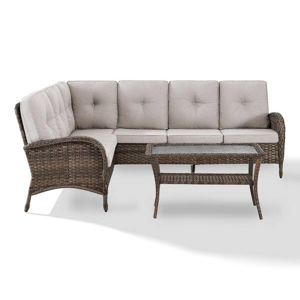 Brown 2-Piece Wicker Patio Conversation Sectional Seating Set with Beige Cushions and Coffee Table