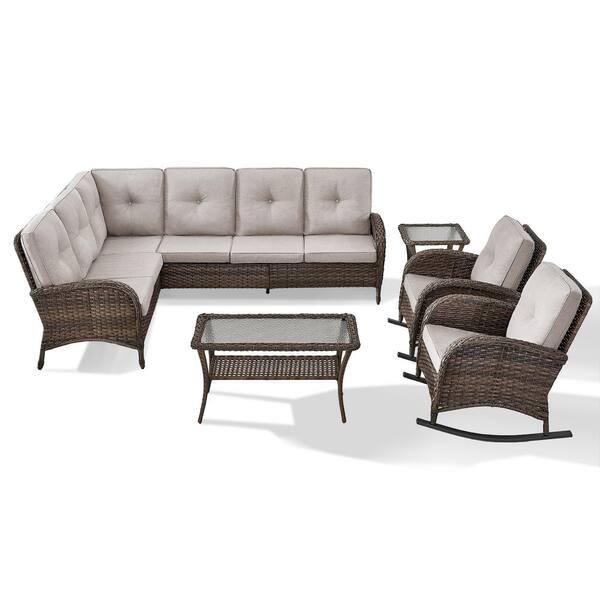 Brown 5-Piece Wicker Patio Conversation Sectional Seating Set with Beige Cushions and Rocking Chairs
