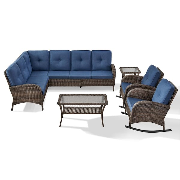 Brown 5-Piece Wicker Patio Conversation Sectional Seating Set with Navy Blue Cushions and Rocking Chairs