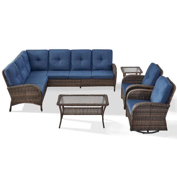Brown 5-Piece Wicker Patio Conversation Sectional Seating Set with Navy Blue Cushions and Swivel Rockers