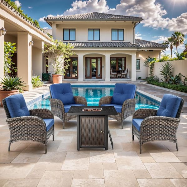 Brown 5-Piece Wicker Patio Fire Pit Set, Outdoor 4-Person Seating Set with Olefin Navy Blue Cushions and Armchairs