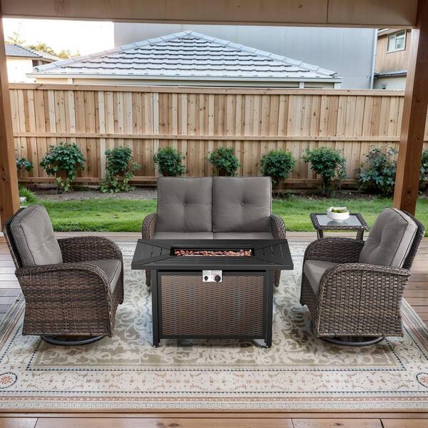 Brown 5-Piece Wicker Patio Fire Pit Set, Outdoor Glider Seating Set with Olefin Gray Cushions and Swivel Rockers