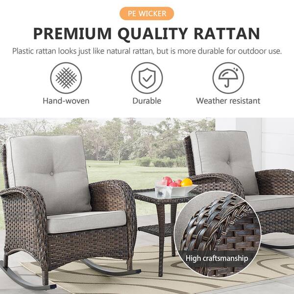 Brown 6-Piece Wicker Outdoor Rocking Chairs Patio Conversation Set with Beige Cushions and Side Tables