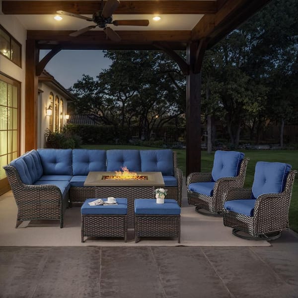 Brown 6-Piece Wicker Patio Fire Pit Set, Outdoor Sectional Seating Set with Olefin Navy Blue Cushions and Swivel Rockers