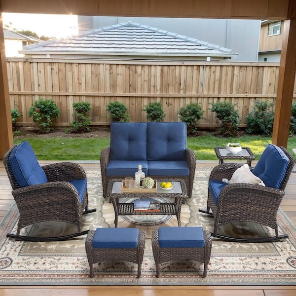 Brown 7-Piece Wicker Patio Conversation Set with Rocking Chairs, Outdoor Glider Seating Set with Navy Blue Cushions