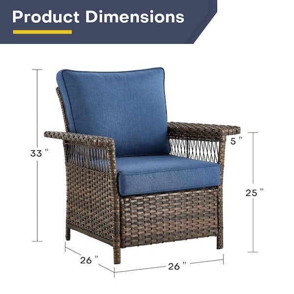 Brown Wicker Outdoor Lounge Chair, PE Rattan Armchair with Navy Blue Cushions for Patio Backyard Porch (2-Pack)