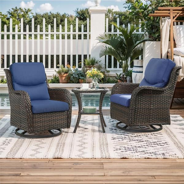 Crescent 3-Piece Brown Wicker Swivel Outdoor Rocking Chairs Patio Conversation Set with CushionGuard Blue Cushions