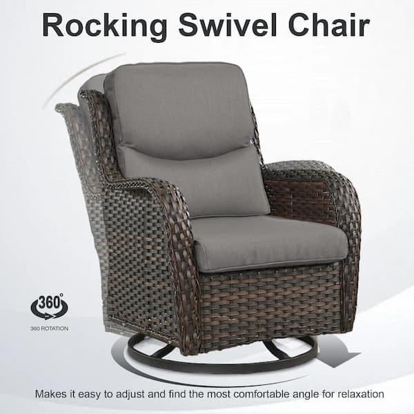 Crescent 6-Piece Brown Wicker Outdoor Swivel Rocker Patio Chairs Patio Conversation Set with Gray Cushions