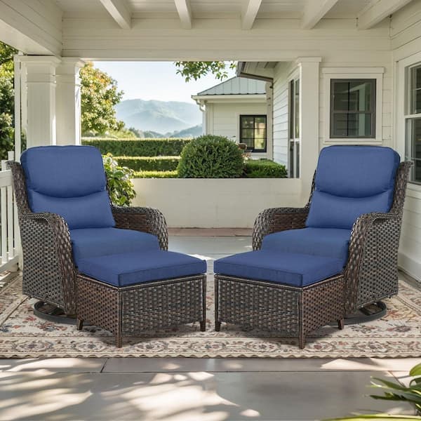 Crescent Brown Wicker Outdoor Rocking Chair Set with 5 in. Thick Navy Blue Cushions, Swivel Rockers, Ottomans (4-Pack)