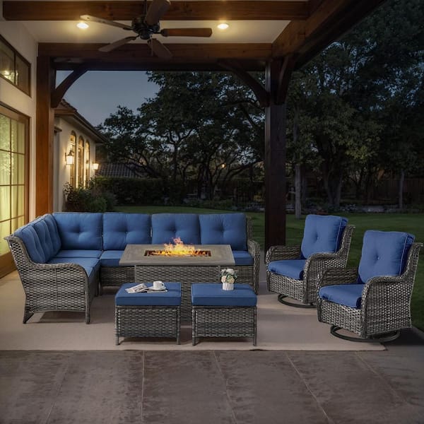 Gray 6-Piece Wicker Patio Fire Pit Set, Outdoor Sectional Seating Set with Olefin Navy Blue Cushions and Swivel Rockers